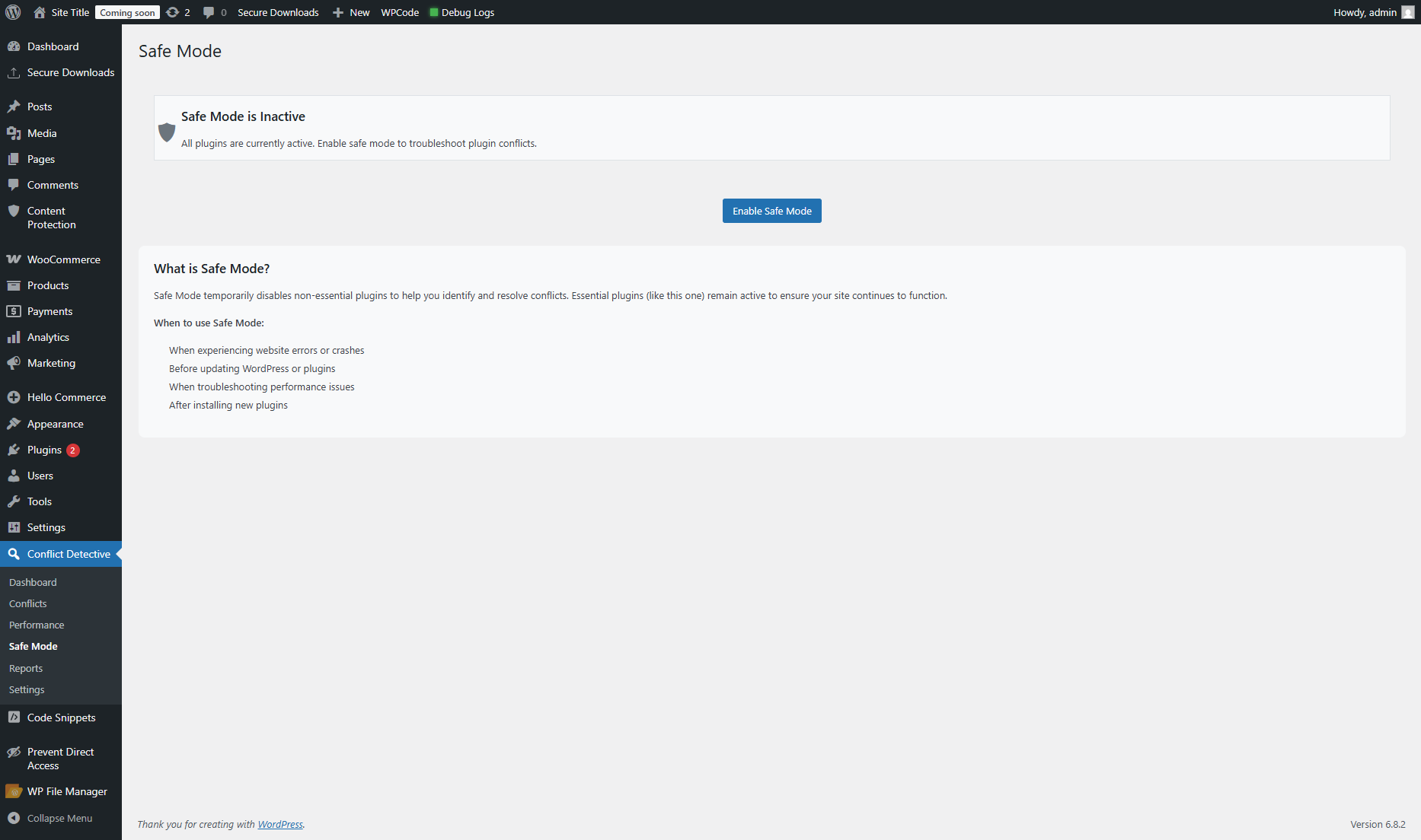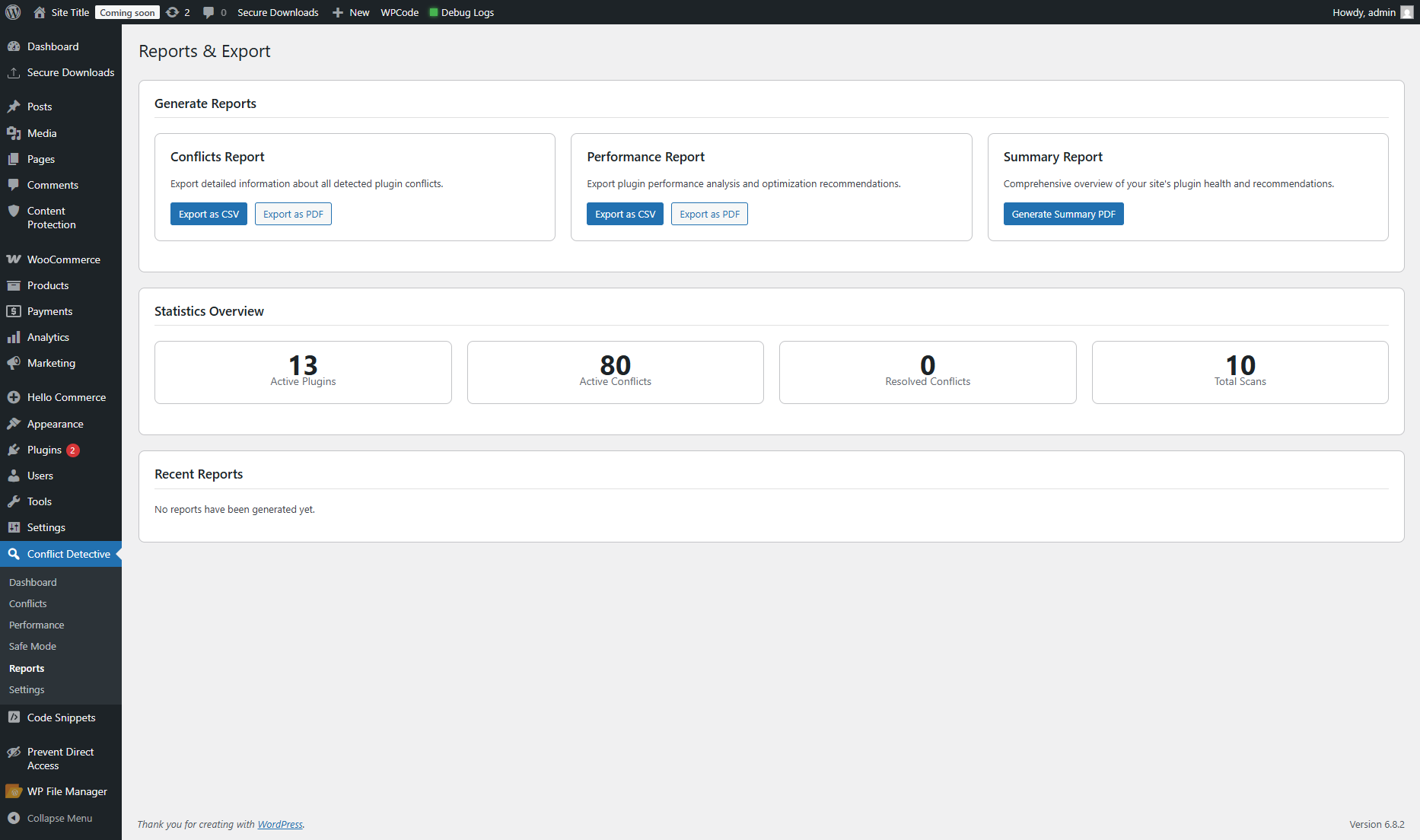 Admin Dashboard: Dedicated “Conflict Detective” menu in wp-admin with live status, performance rankings, update history, Safe Mode toggle, and exportable PDF/CSV reports.