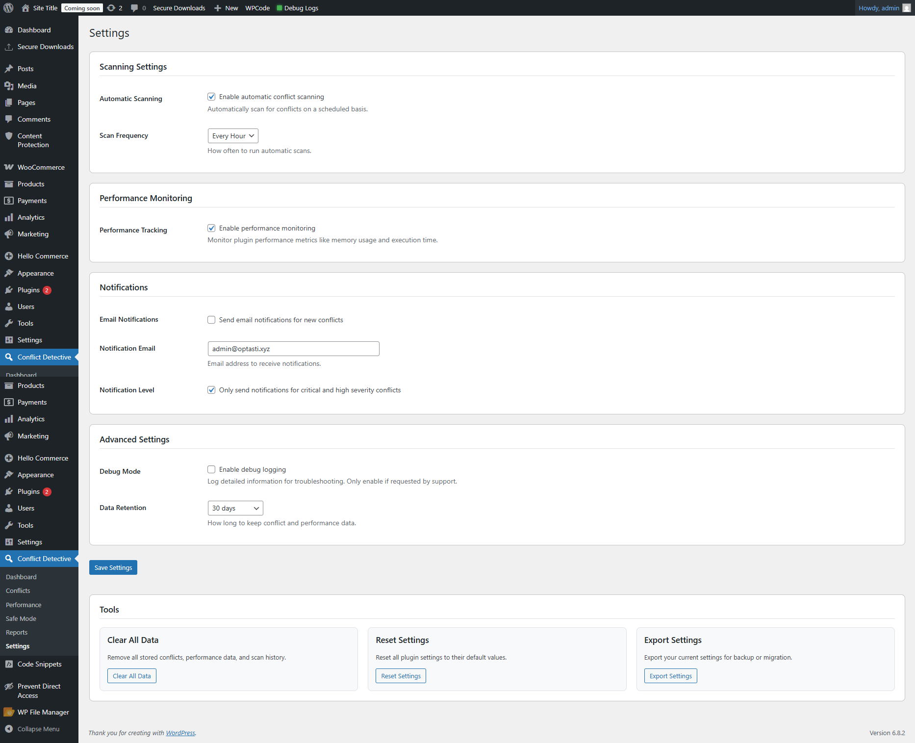 Real-Time Conflict Detection: Automatically scans active plugins for function, class, hook, constant, and shortcode conflicts, delivering instant, detailed reports.